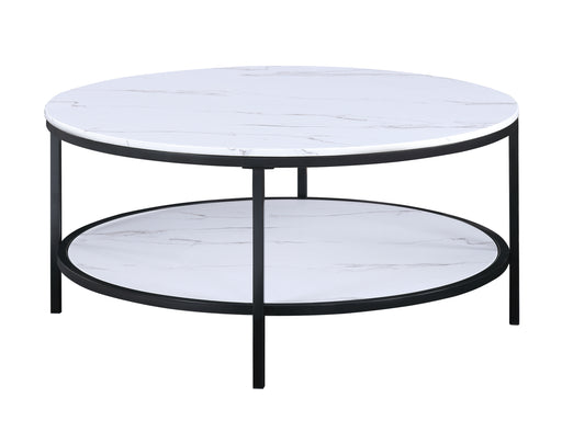 ACME WestACME Telestis Coffee Table, White Marble & Black, 40" x 40" x 15"H, 106lbs. Features: - Occasional Table - NO Storage - Marble Top - Metal "V" ...