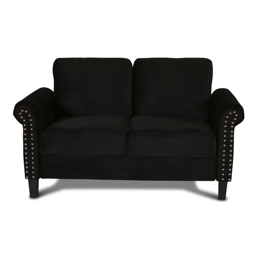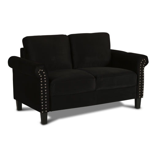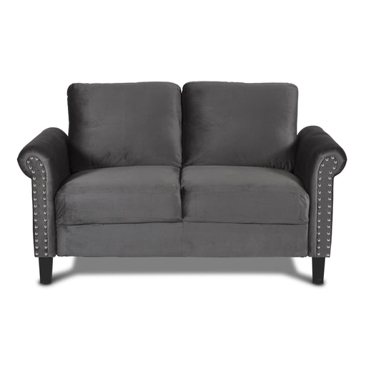 Homelegance (Fremont Warehouse)With a tailored look that is achieved with flared arms, clean lines, and a gray velvet cover, the love seat of the Dunleith Collection provides bol...