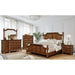 Classic, almost farmhouse, in its appearance, this bedroom collection showcases how even natural tones can pop out in a room. The paneled bed is held by four beautifully turned posts that ooze with pastoral elements. The accompanying case goods sit peacefully atop round bun feet that taper to a point. A prominent wood grain eases the lavish design details into its homey state.
