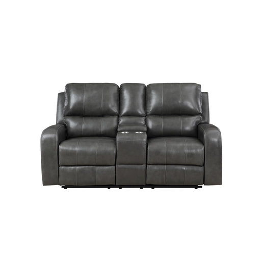 LINTON LEATHER CONSOLE LOVESEAT W/ DUAL RECLINERS-GRAY