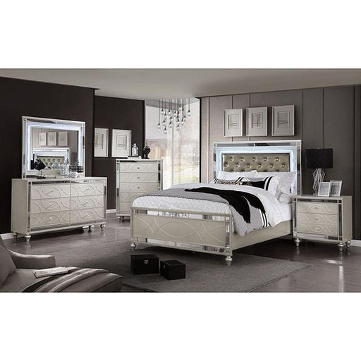 MANAR Cal.King Bed, 90 1/4"L X 79"W X 62 1/4"H, 198lbs. The glamor is in the details of this bedroom set from the Manar Collection. The headboard is upholstered in a faux leatherette, button-tufted with crystal-acrylic buttons, and embedded with a LED light, creating a sparkling aesthetic. The matching pieces feature a decorative, circular pattern, only adding to opulence of the design. Your bedroom will be a place to pamper yourself with this set.